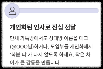 - **1. 중복 인사 방지:** 단체 카톡방 전송 시에는 반드시 상대방의 이름을 태그(@OOO님)하거나, 그룹 인사가 아닌 개인 인사처럼 느껴지도록 도입부를 개인화하세요. 일명 '복붙 티 안 나게 보내기'가 핵심입니다.