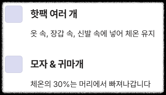 - 핫팩 (필수): 옷 속, 장갑 속, 신발 속에 넣어 체온을 지켜주세요. 여러 개 챙기는 것을 추천합니다.