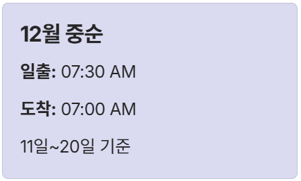 | 12월 중순 (11일~20일) | 약 07:30 AM 전후 | 07:00 AM |