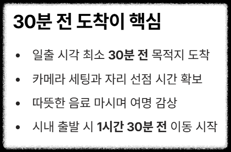 일출 시각 최소 **30분 전**에는 목적지에 도착해 자리를 잡고 대기하는 것이 좋습니다. 이 시간에 카메라를 세팅하고, 따뜻한 음료를 마시며 여명을 감상하는 것이 진정한 '일출 낭만'이에요. 시내에서 이동한다면 주차 및 이동 시간을 고려해 **최소 1시간 30분 전**에는 출발하는 것을 추천드립니다!