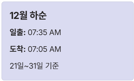 | 12월 하순 (21일~31일) | 약 07:35 AM 전후 | 07:05 AM |