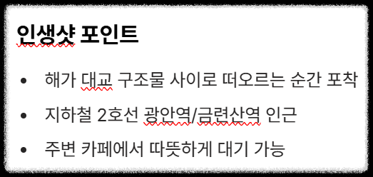 - 접근성: 지하철 2호선 광안역/금련산역에서 가까우며, 주변의 카페나 레스토랑에서 따뜻하게 일출을 기다릴 수도 있습니다.