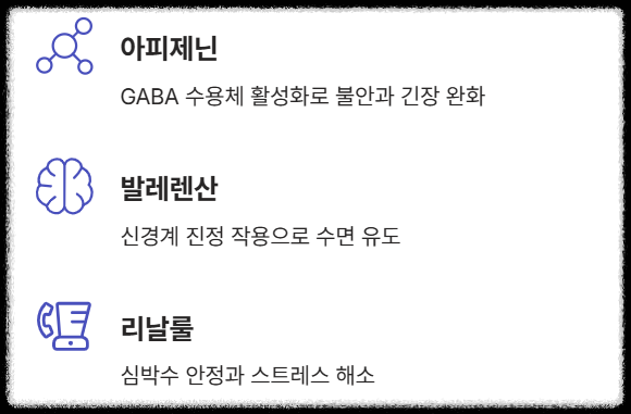 | 카모마일 | 아피제닌 | 불안 완화, 진정 작용 |