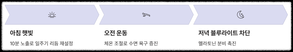 | 카페인/알코올 | 취침 6시간 이내 카페인 섭취 금지. 알코올은 잠을 깨게 하므로 절대 금물입니다. |