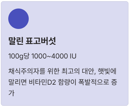 - **표고버섯**을 먹을 땐: 참기름이나 들기름을 넣어 볶아 드세요. 버섯의 D2 비타민이 지방 성분과 결합하여 흡수 효율이 올라갑니다.