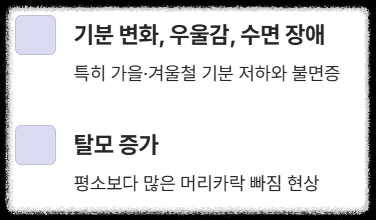 - 특히 일조량이 부족한 가을과 겨울에 우울감을 호소하는 분들이 많죠. 일명 계절성 정서 장애(SAD)입니다. 비타민 D는 뇌의 신경전달물질 합성과정에 관여하며, 연구에 따르면 비타민 D 수치가 낮은 사람에게서 우울증 위험이 높게 나타납니다. 햇빛을 쬐면 기분이 좋아지는 것도 이와 무관하지 않아요.