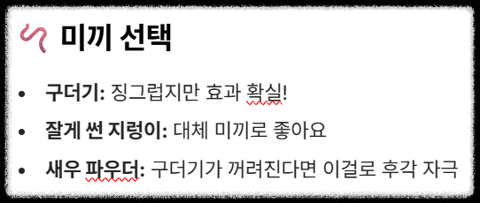 - ✅ 방한 부츠 & 두꺼운 양말: 발끝 시린 것만큼 고통스러운 게 없어요!