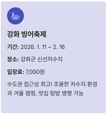 | 강화 빙어축제 | 2026. 1. 11. ~ 2. 16. (예정) | 강화군 내가면 신선저수지 | 7,000원 (낚시터 이용료) |