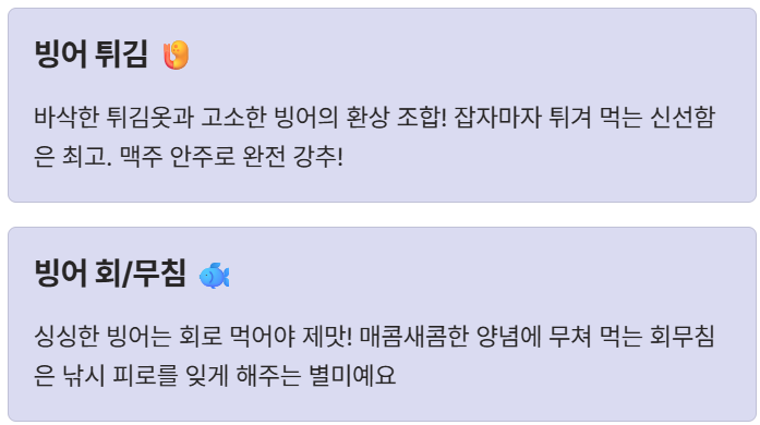 - 빙어 튀김: 바삭한 튀김옷과 고소한 빙어가 만나 환상의 맛을 자랑해요. 잡자마자 튀겨 먹는 신선함은 정말 최고! 맥주 안주로 완전 강추입니다.