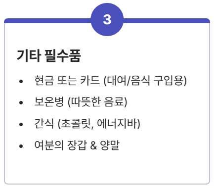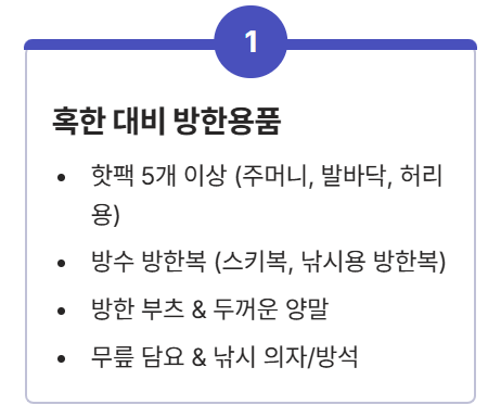 - ✅ 핫팩: 대용량 핫팩 5개 이상 (주머니, 발바닥, 허리에 부착)