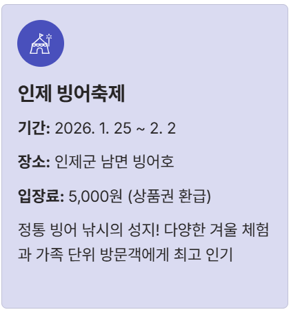 | 인제 빙어축제 | 2026. 1. 25. ~ 2. 2. (예정) | 인제군 남면 부평리 빙어호 일원 | 5,000원 (상품권 환급) |