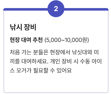 낚싯대와 미끼는 보통 현장에서 판매하거나 대여해 줍니다. 처음 가는 분들은 현장 대여(보통 5,000~10,000원 선)를 추천해요. 개인 장비를 가져갈 경우, 얼음 구멍을 뚫는 수동 드릴(수동 아이스 오거)이 필요할 수 있으니 확인해야 합니다.