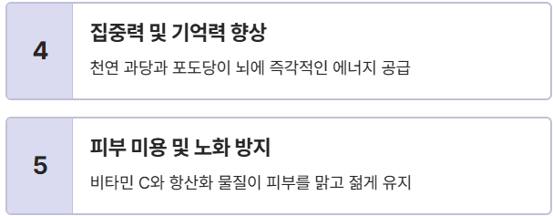 - 피부 미용 및 노화 방지: 비타민 C와 퀘르세틴 같은 항산화 물질이 활성 산소를 잡아 노화를 늦추고 피부를 맑게 유지하는 데 도움을 줍니다.