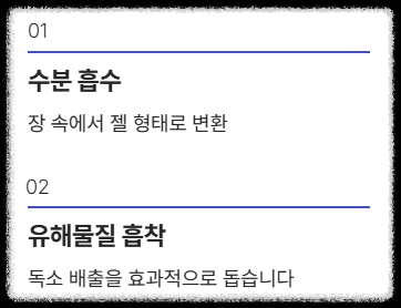 - 장 속에서 수분을 흡수하여 젤 형태로 변하는데, 이 과정에서 유해 물질 흡착 및 배출을 돕고 배변 활동을 원활하게 해줍니다. 꾸준히 마시면 소화 개선에 정말 도움이 돼요.