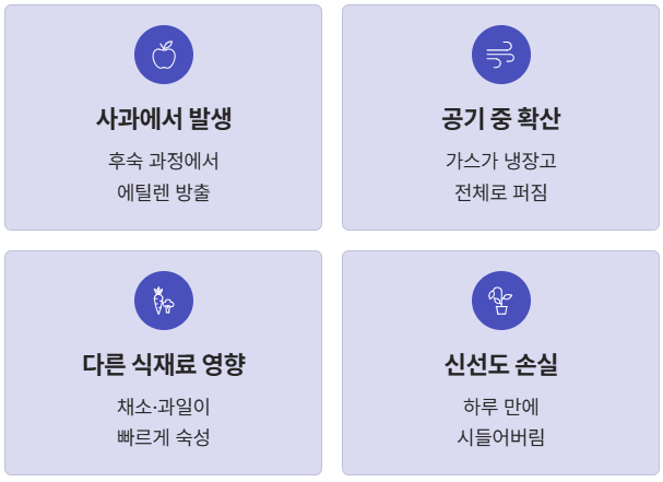 에틸렌은 식물이 스스로 생산하는 무색, 무취의 천연 식물 호르몬이에요. 사과가 후숙(익어가는 과정)을 할 때 주로 방출되는데, 이 가스는 사과 자체의 조직을 무르게 만들고 당도를 급격히 높여요.