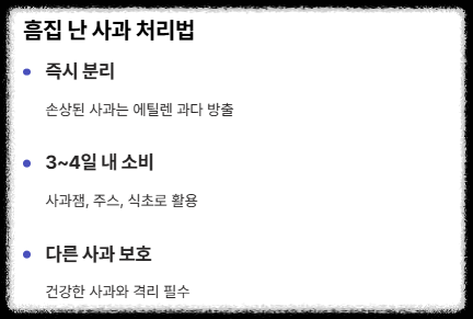 - 1단계 - 선별과 격리: 흠집 난 사과는 즉시 분리하고, 에틸렌 가스 때문에 모든 사과를 채소나 다른 과일과 무조건 격리하세요.