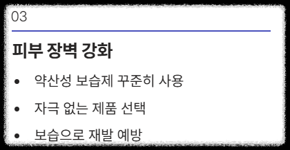 - 습진 부위가 아물면, 반드시 약산성 보습제를 꾸준히 발라 피부 장벽을 회복시켜야 재발을 막을 수 있습니다. 건조하다고 오해하기 쉽지만, 습진 피부는 보습에 더 취약합니다.
