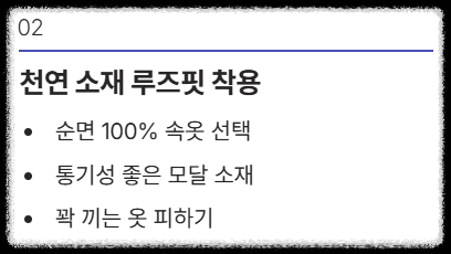 - 의류 선택: 천연 소재와 루즈핏을 고집하세요.