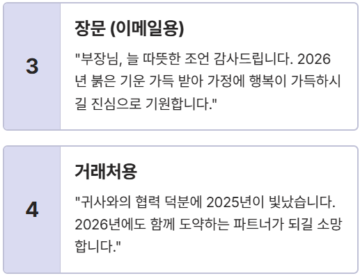 4. 거래처: "귀사와의 협력 덕분에 2025년이 빛났습니다. 2026년에도 함께 도약하는 파트너가 되길 소망합니다."