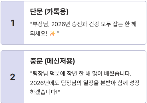 1. 단문: "부장님, 2026년 승진과 건강 모두 잡는 한 해 되세요! ✨"