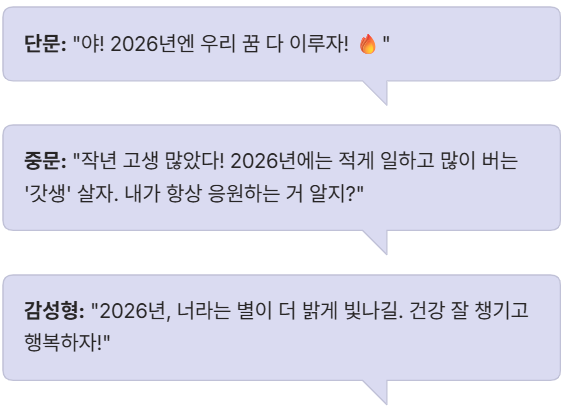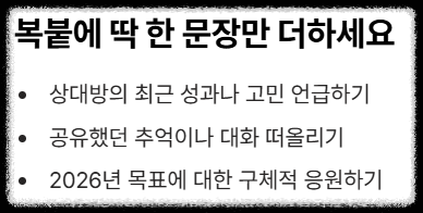 3. 장문: "친구야, 2025년 다사다난했지? 2026년에는 네가 계획한 여행, 공부 다 성공하길 바랄게. 조만간 얼굴 보자!"