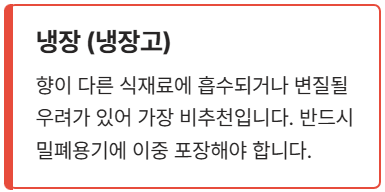 | 냉장 (냉장고) | 향이 다른 식재료에 흡수되거나 변질될 우려가 있어 가장 비추천합니다. 반드시 밀폐용기에 이중 포장해야 합니다. |