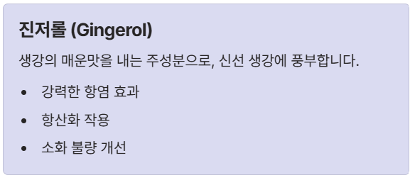 - 진저롤 (Gingerol): 생강의 매운맛을 내는 주성분이에요. 신선 생강에 풍부하며, 강력한 항염 및 항산화 효과를 발휘하며 소화 불량 개선에도 도움을 준답니다.