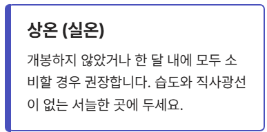 | 상온 (실온) | 개봉하지 않은 상태이거나, 한 달 내에 모두 소비할 경우 권장합니다. 습도와 직사광선이 없는 서늘한 곳에 두세요. |