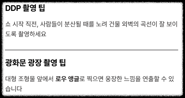 사진은 '빛의 명암 대비'를 활용해야 해요. DDP에서는 쇼 시작 직전, 사람들이 분산될 때를 노려 **건물 외벽의 곡선**이 잘 보이도록 찍으세요. 광화문 광장에서는 대형 조형물 앞에서 **로우 앵글**로 찍으면 훨씬 웅장한 느낌을 줄 수 있답니다.