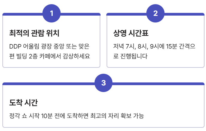 미디어 파사드 쇼는 저녁 17:00~23:00 운영, 라이트 퍼포먼스 17시·18시·19시·20시·21시에 15분 간격으로 진행됩니다. 가장 웅장한 연출을 놓치지 않으려면 **정각 쇼 시작 10분 전**에 DDP 어울림 광장 중앙이나 맞은편 2층 카페에 도착하는 것이 좋아요.