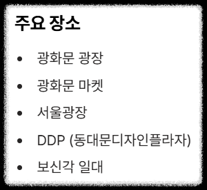 | 핵심 장소 | 광화문 광장, 광화문 마켓, 서울광장, DDP (동대문디자인플라자), 청계천, 보신각 일대 |