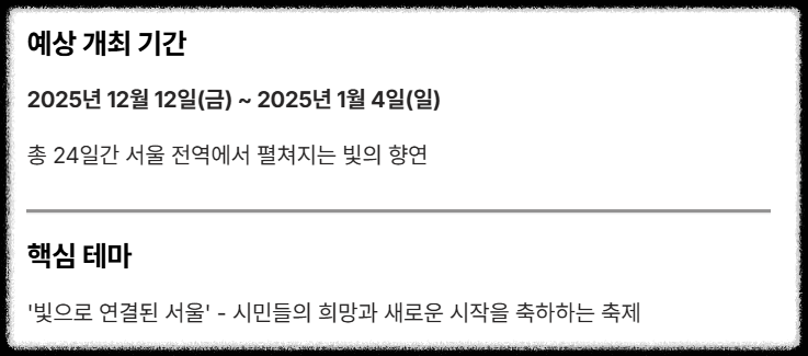 | 개최 기간 | 2025년 12월 12일 (금): PM7시 광과문 광장 개막식 ~ 2026년 1월 4일 (일) (총 24일간) |