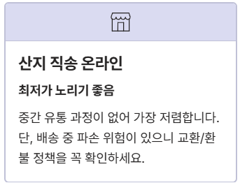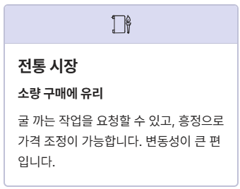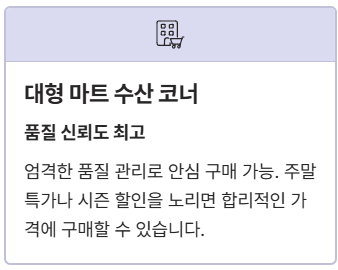- ✅ 대형 마트 수산 코너: 품질 관리가 엄격하고 신뢰도가 높습니다. 주말 특가나 시즌 할인 이벤트를 노리면 합리적인 가격에 구매 가능합니다.