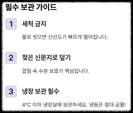 - 세척 금지: 겉면에 묻은 이물질을 굳이 씻어낼 필요는 없습니다. 씻으면 오히려 신선도가 빠르게 떨어져요.
