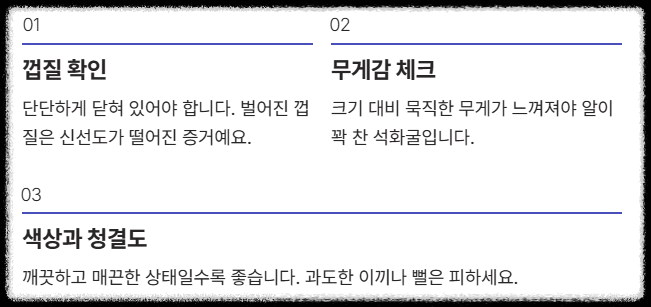 - 무게감: 크기에 비해 묵직한 무게가 느껴져야 알이 꽉 찬 **석화굴**입니다. 빈 껍질은 무게가 가벼워요.