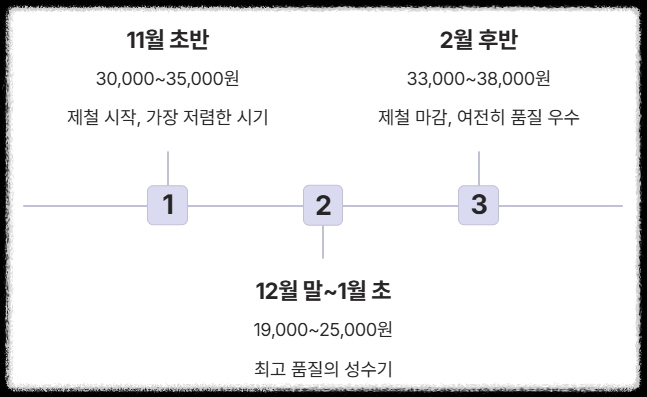 | 11월 (제철 초반) | 30,000원 ~ 35,000원 | 가격이 가장 저렴한 시기. 알이 조금 작을 수 있음. |