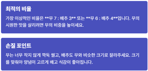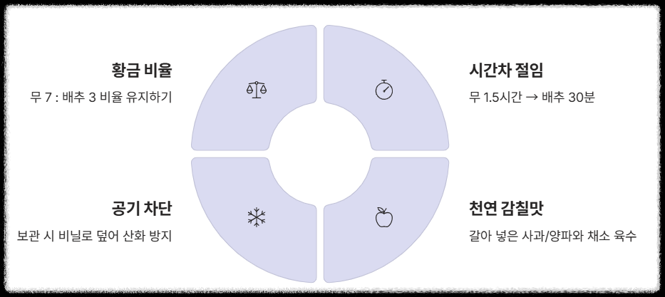 | 필수 재료 | 계량 (무 1개, 배추 1/2포기 기준) | 비법 Tip |