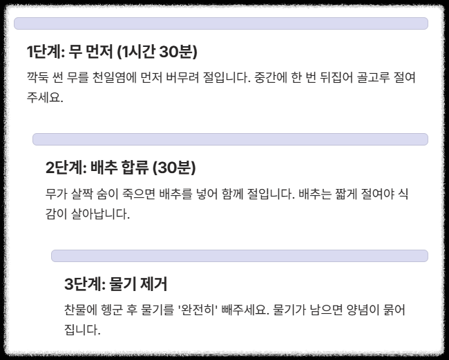 - **1단계 (절임)**: 무를 소금(천일염 권장)에 먼저 버무려 약 1시간 30분 절입니다. 중간에 한 번 뒤집어주세요.