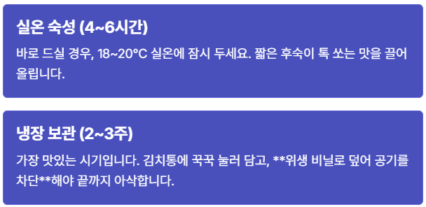 - **바로 먹을 때**: 실온(18~20°C)에서 4~6시간 정도 두었다가 냉장 보관하세요. 이 짧은 시간의 후숙이 시원한 맛을 극대화합니다.