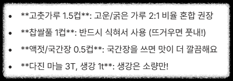 | 고춧가루 | 1.5컵 | 고운 고춧가루 1컵, 굵은 고춧가루 0.5컵 섞기 |
