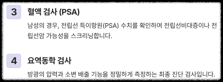 | 남성 (50대 이상) | 약뇨, 남성잔뇨 | 전립선비대증 (BPH, ~70%) | 방광 결석, 요도 협착 |