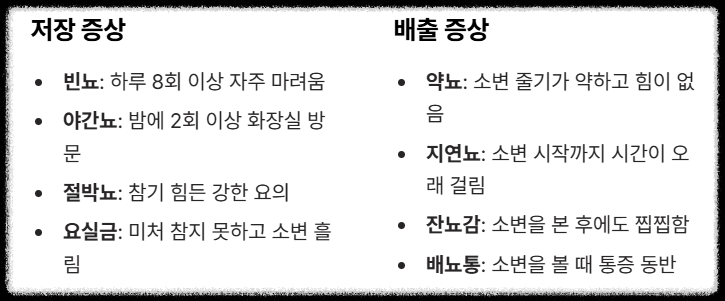| 저장 증상 | 절박뇨, 요실금 | 소변이 마려우면 참기 힘들거나, 미처 참지 못하고 흘립니다. |