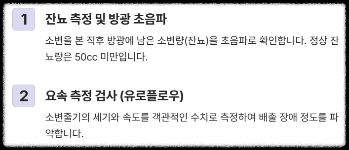 - 잔뇨 측정 및 방광 초음파: 소변을 본 직후 방광에 남은 소변량(잔뇨)을 초음파로 확인합니다.