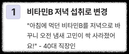 | 1위 | **비타민B 복합제 저녁 섭취로 변경** | "아침에 먹던 비타민B를 저녁으로 바꾸니 오전에 냄새 고민이 싹 사라졌어요. 밤새 배출되게 한 거죠!" (40대 직장인 A씨) |