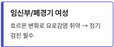 **임신부**는 호르몬 변화와 태아 압박으로 요로감염에 취약해지고 냄새가 심해지기 쉽습니다. 특히 임신 중 소변냄새가 심할 때는 세균이 신장으로 올라갈 위험이 있으니 정기 검진을 놓치지 말아야 합니다. **폐경기 여성**은 에스트로겐 감소로 요도 주변 환경이 알칼리성으로 변해 잦은 방광염과 악취를 경험할 수 있습니다.