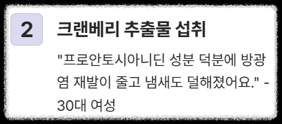 | 2위 | **크랜베리 추출물 또는 주스 섭취** | "습관성 요로감염이 있었는데, 크랜베리의 프로안토시아니딘 성분 덕분에 방광염 재발이 줄고 냄새도 덜해졌어요." (30대 여성 B씨) |