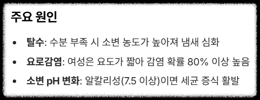 두 번째는 **요로감염**입니다. 여성의 경우 요도가 짧아 남성보다 감염 확률이 80% 이상 높으며, 세균이 소변을 분해하면서 강한 암모니아 냄새를 유발합니다. 특히 소변 pH가 알칼리성(7.5 이상)으로 변하면 세균 증식이 더 활발해지면서 냄새도 심해져요.