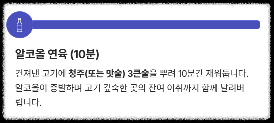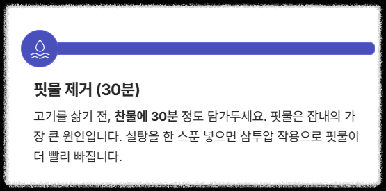 - 핏물 & 잡내 제거: 찬물에 30분, 청주 3큰술로 **완벽한 잡내 제거**를 완료했습니다.