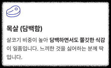 - **목살:** 살코기가 많아 **담백하고 쫄깃**한 식감을 선호하는 분께 추천.