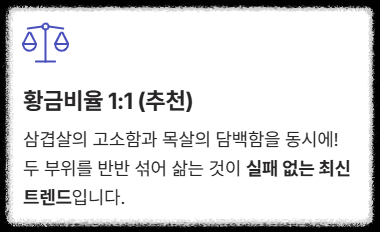 - **삼겹살:** 지방이 많아 **야들야들하고 촉촉**한 식감을 선호하는 분께 추천.
